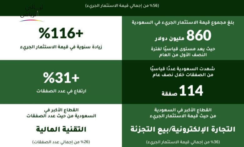كشف تقرير الاستثمار الجريء في المملكة العربية السعودية للنصف الأول من عام 2025 أن المملكة حققت رقمًا قياسيًا في حجم الاستثمار الجريء في النصف الأول من عام 2025 الذي شهد تنفيذ استثمارات بقيمة قياسية بلغت 3.2 مليار ريال (860 مليون دولار) في شركات ناشئة سعودية، محققًة نموًا بنسبة بلغت 116% مقارنة بالنصف الأول من عام 2024، لتتجاوز حجم الاستثمار الجريء في عام 2024 بالكامل.